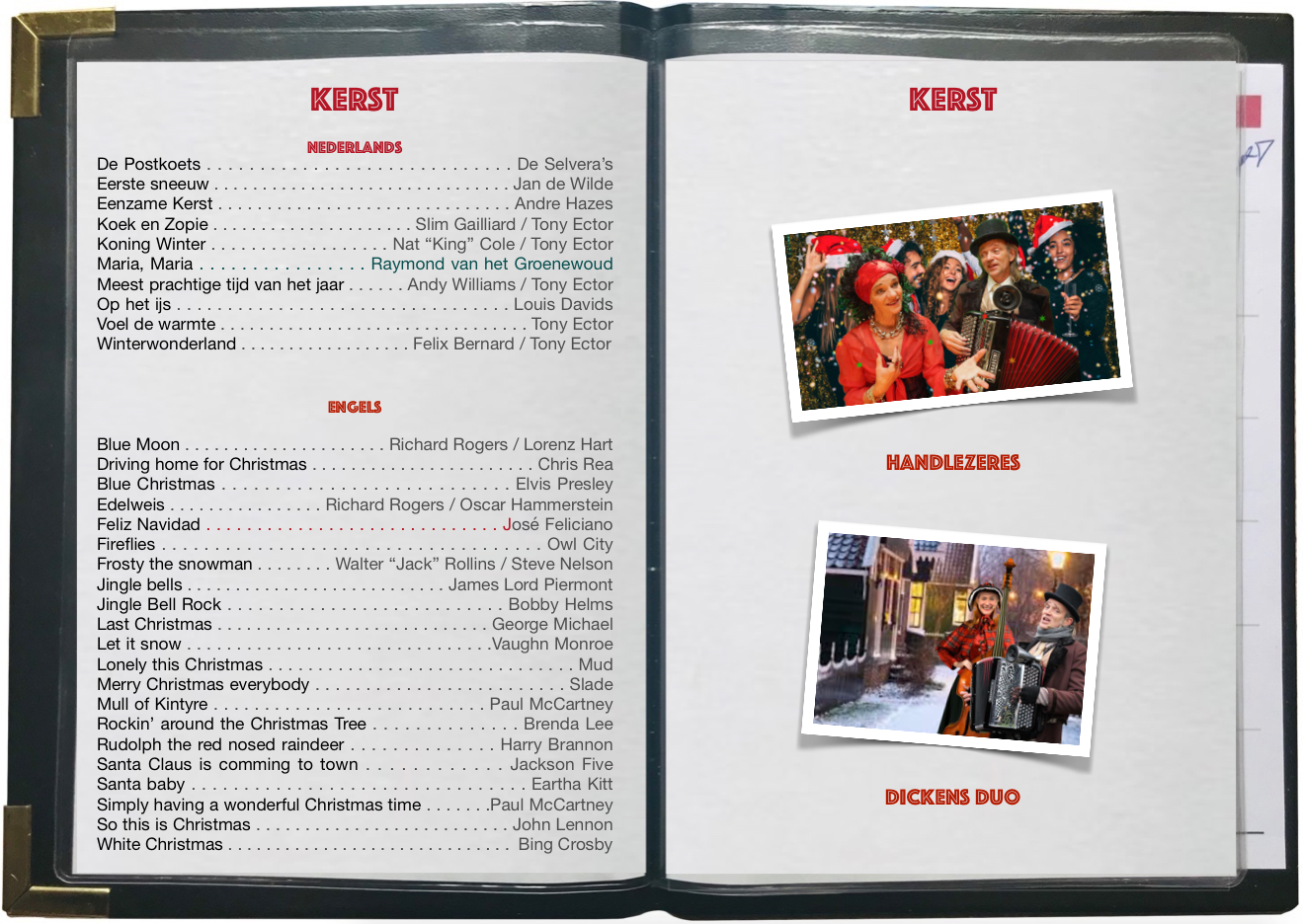 MUSIQUE À LA CARTEDit is een echte menukaart met daarop alle liedjes die ik als solo troubadour speel. De gasten kunnen hier hun favoriete liedje uitkiezen. Neem contact op als je favoriete liedje er niet bij staat en je wilt het toch graag horen. Vaak lukt dat wel…